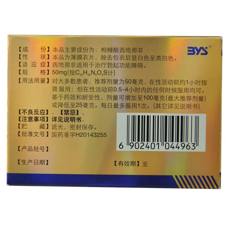 | 适应症: | 本品适用于治疗勃起功能障碍。 | |||
